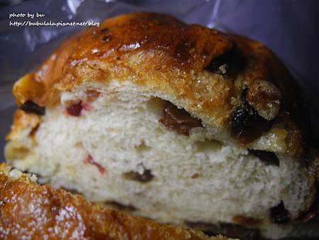 內餡有葡萄乾及蔓越莓顆粒,扎實柔軟麵包,咬下口時滿嘴充斥著葡萄香味及些許糖粉於舌尖跳動